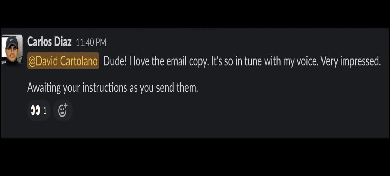 "Dude! I love the email copy. It's so in tune with my voice. Very impressed!"