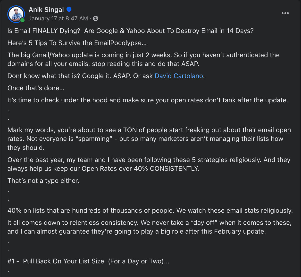 Hey, I'm David Cartolano.My start to business and marketing began with failing out of a doctor of physical therapy program,Joining a mastermind 3 days later,And taking a 22 hour train ride to live on my twin brother's couch.Email marketing became my unexpected breakthrough 8 months later.I created a multi-5 figure campaign for my old job from a simple $197 product.Fast forward to today...I've done a lot of work finding revenue in customer lists, implementing A.I., vibe coding and lifecycle marketing.
