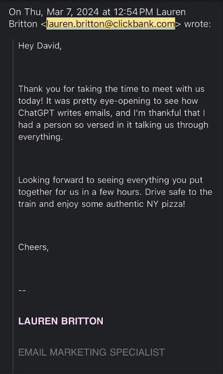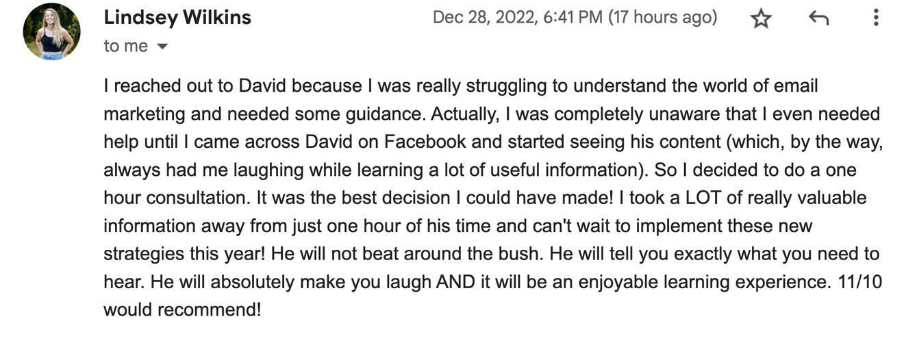 "Dude! I love the email copy. It's so in tune with my voice. Very impressed!"